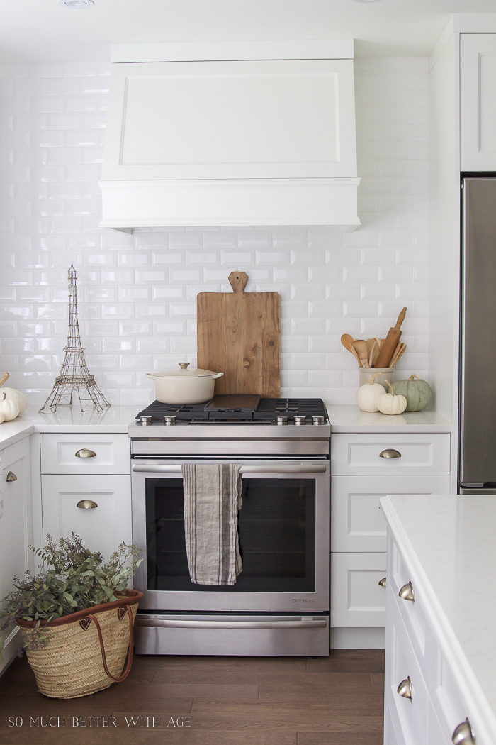 Fall Kitchen Tour /kale, eucalyptus floral arrangement, heirloom pumpkins, gold faucet - So Much Better With Age